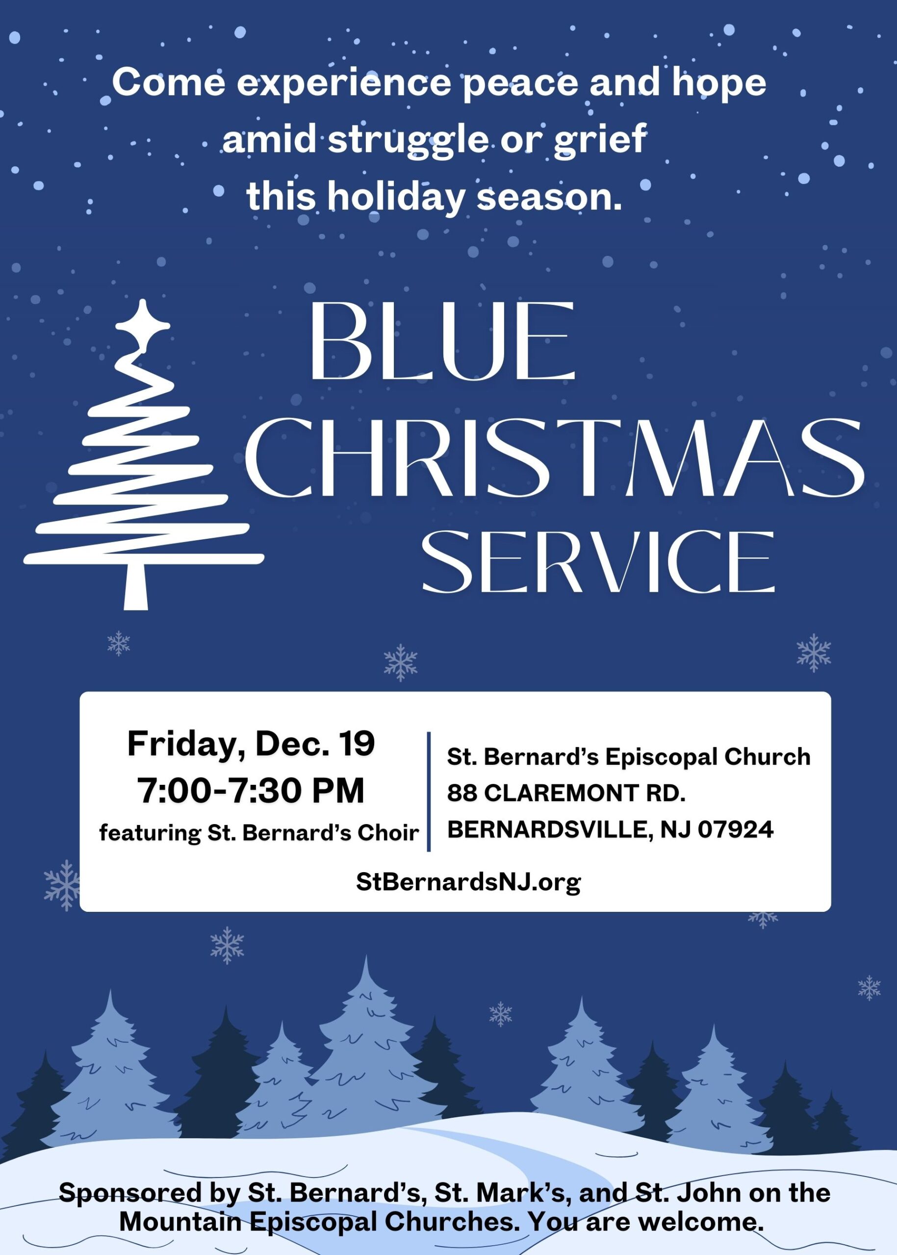 A Christmas service for peace and hope amid any struggle or grief will be offered by the three Episcopal parishes of St. Bernard's, St. John on the Mountain, and St. Mark's, Basking Ridge. The service will be led by the Rev. Beth Rauen Sciaino, with music.
