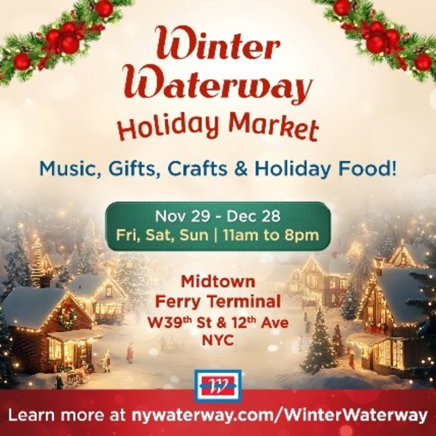 NY Waterway, which operates the largest ferry fleet between New Jersey and New York, will hold its Winter Waterway Holiday Market – featuring music, festive food, shopping, crafts and special activities for kids – on Fridays, Saturdays and Sundays, from November 29 to December 28, from 11 am to 8 pm, inside the Midtown Ferry Terminal, 459 12th Ave. at West 39th Street, in Manhattan.