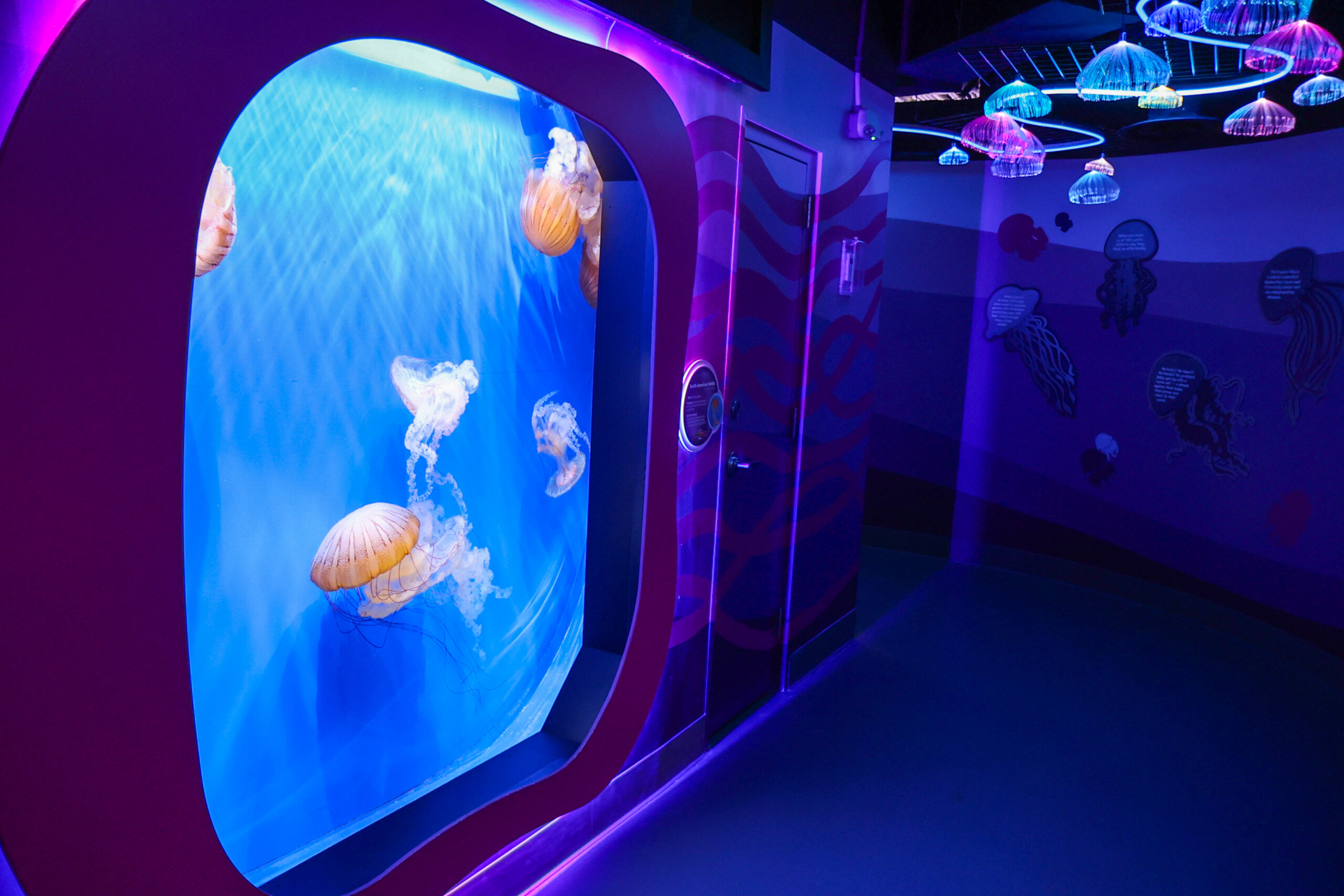Tucked in Glowing Grotto, Kaleidoscope Cove’s corner of bioluminescent species, the jellyfish wall houses Blue Blubber Jellyfish, an Indo-West Pacific jellyfish that ranges in color from white to light blue to dark purple and appears to glow in certain light.