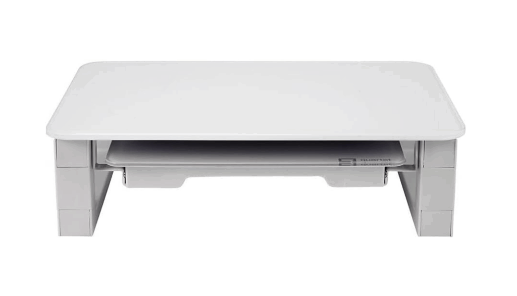 This riser has 3 adjustable height levels, 2 1/4″, 3 3/4″, and 5 1/4″, so you can set their laptop or monitor at eye-level. This also has a retractable 5″ x 10″ glass dry-erase board so they can write down notes and tuck them away to keep their physical desktop clutter to a minimum (again, a mom can dream). The riser comes with an accessory tray, a dry-erase marker, and the surface measures 10 1/4″ x 14″. Glass Monitor Riser, $79.86