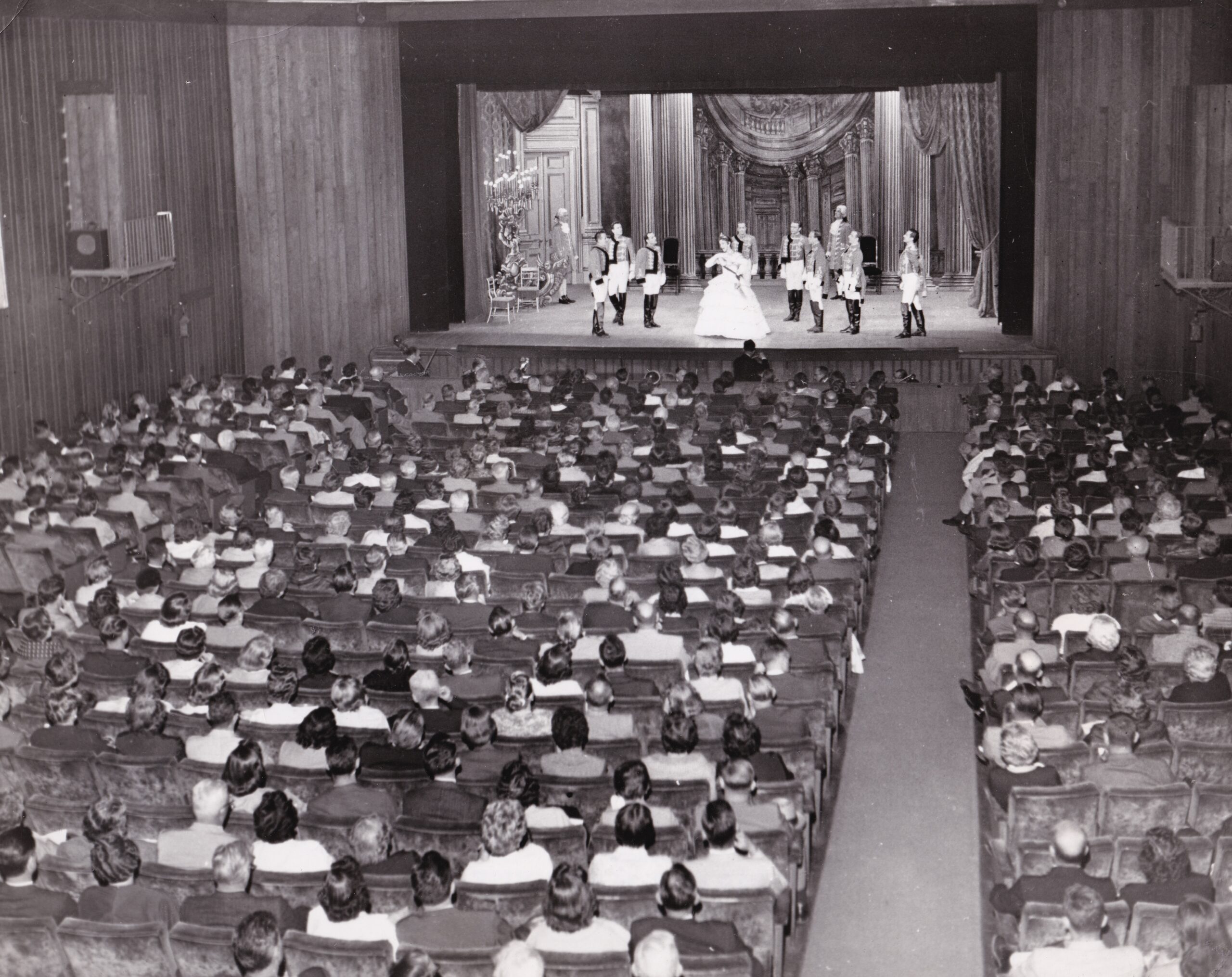 The Surflight Theatre’s modest roots began inside a shaky 2,200-seat tent in 1950. Sixty cast members, plus a 12-piece orchestra, performed for just three weeks. The following year, interest grew, and the theater’s season extended to nine weeks. Performances were moved into an old meat market in 1952, the inside of a garage next to a bowling alley in 1953, and a former mechanic’s garage in 1954.