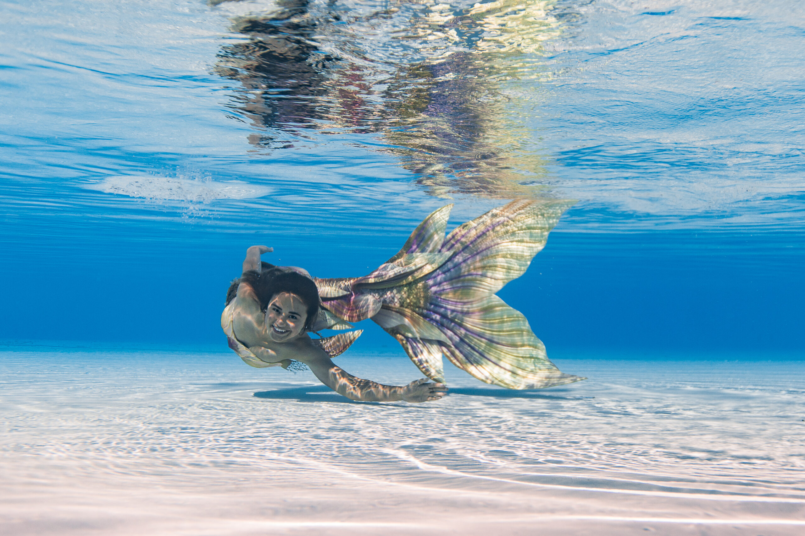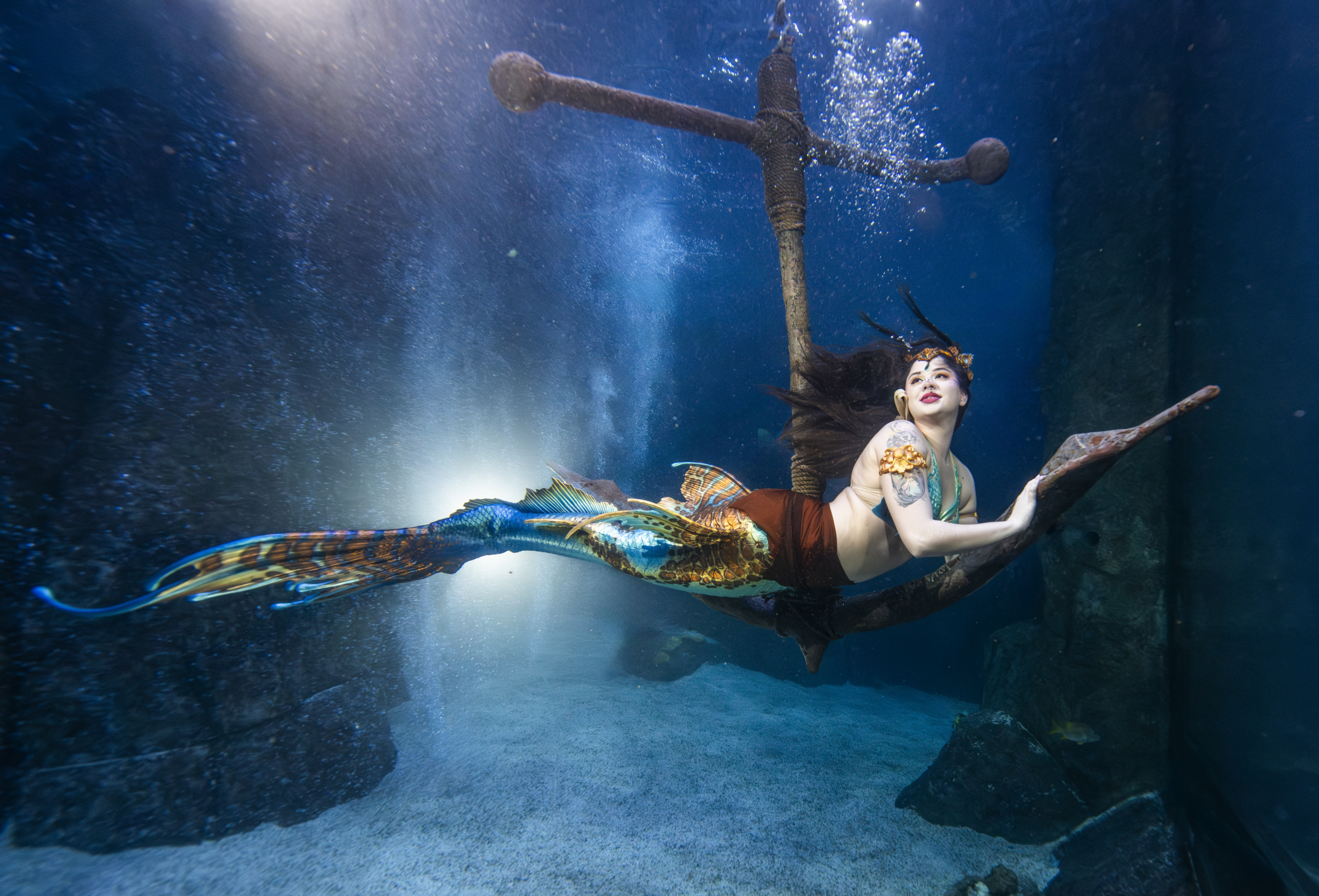Above the water, at the Mermaid Beach Club, a mermaid will sit in the Touch Tank surrounded by cow nose and southern stingrays, singing and even blowing kisses.