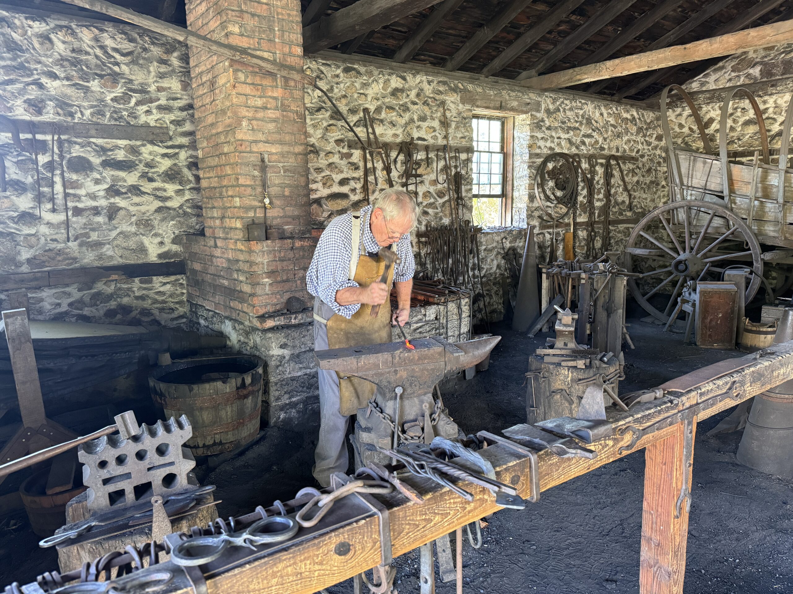 The historians will talk with you as if you were living in the 1800s, and offer demos. A blacksmith will heat iron in the forge; a brewmaster will let kids mill the hops; a dressmaker will show how clothing was sewn; and a potter will mold clay into vases.