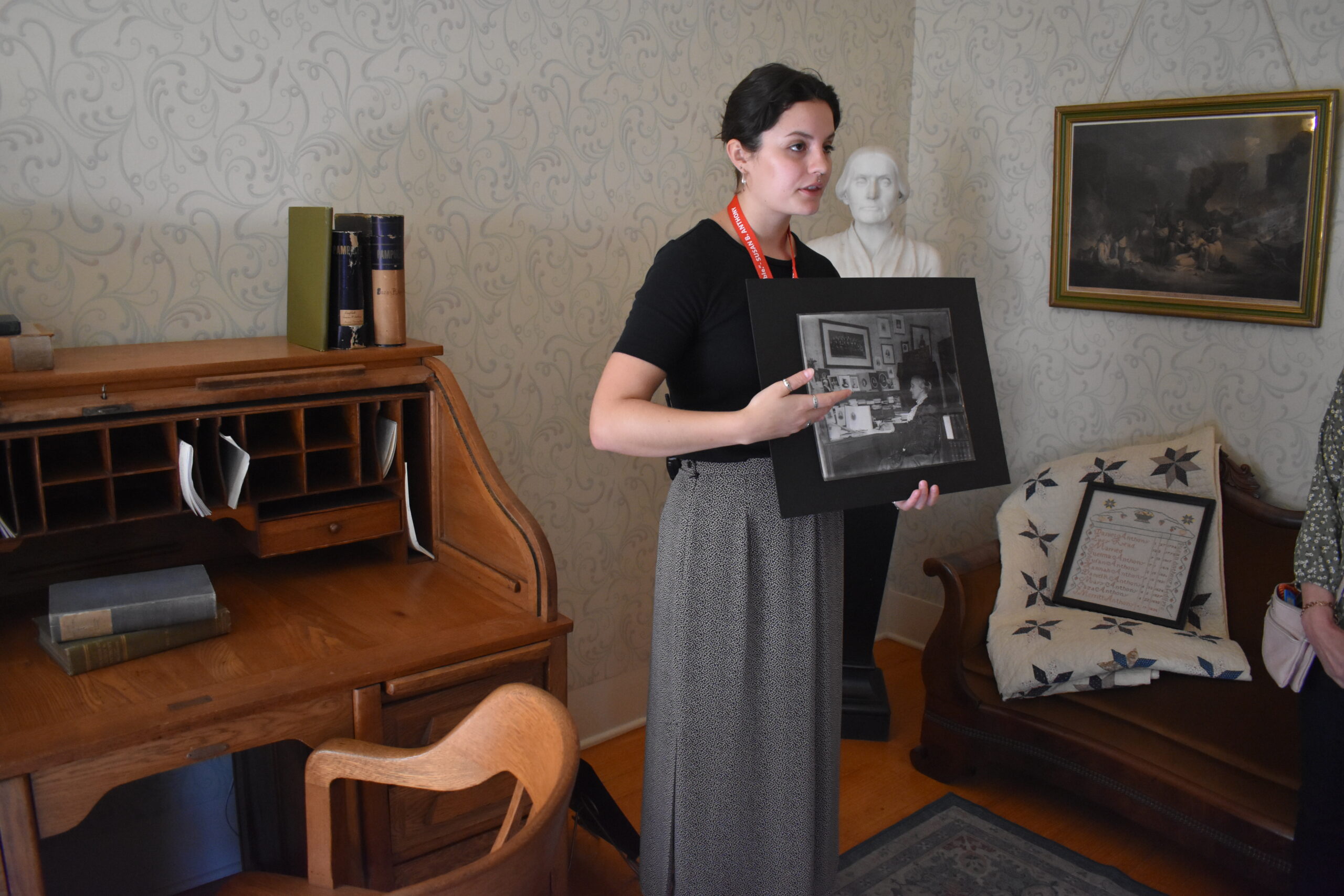 After you climb the narrow stairs to the third floor, you’ll come to an opening in the attic where the National American Woman Suffrage Association met, which has her original desk from her New York City office, as well as papers with Anthony’s handwriting.