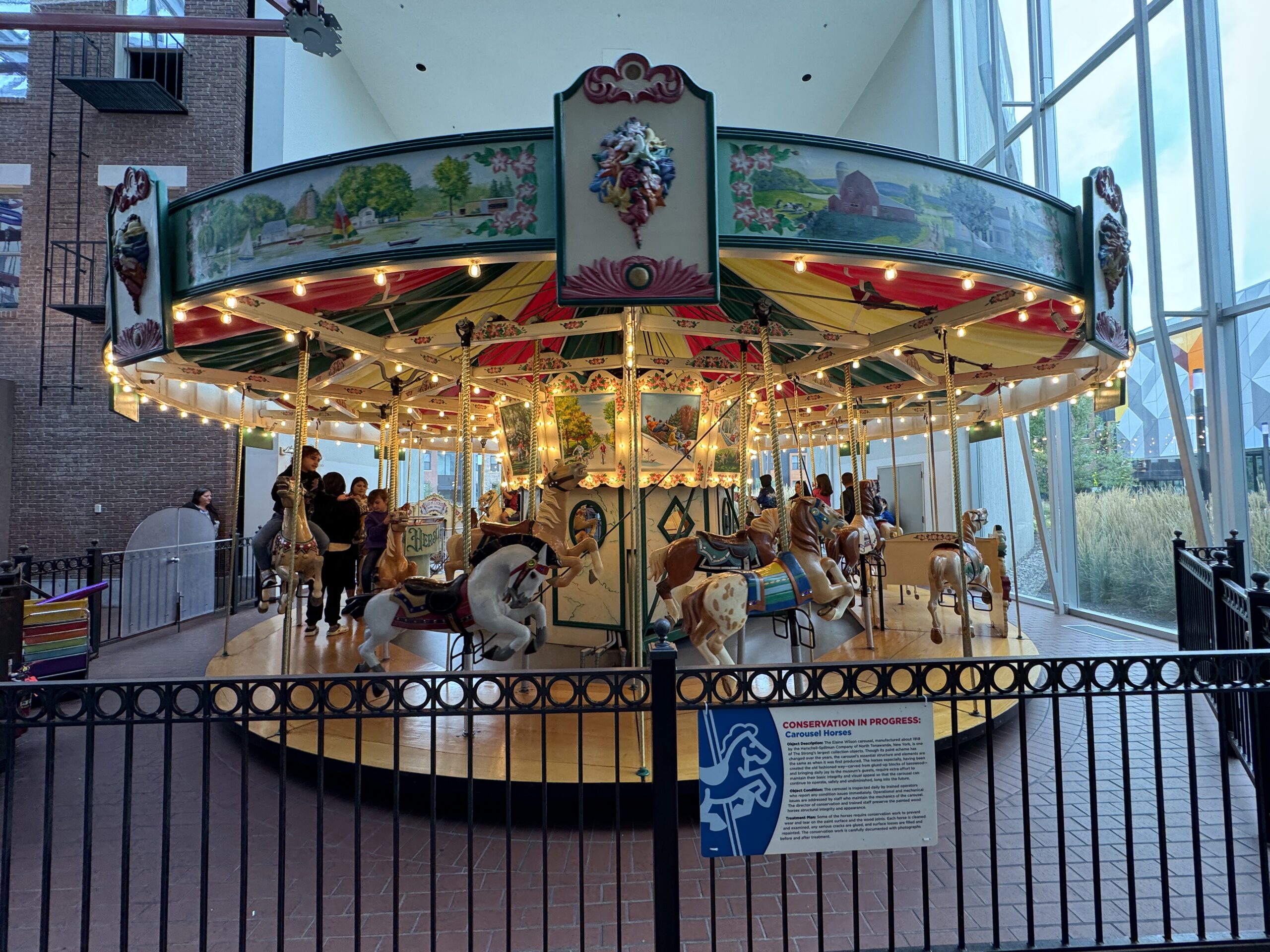 There is a lot of ground to cover here, literally, and it’s hilly, so if you need a break head to the indoor John L. Wehle Gallery, which has rotating exhibits. We saw children’s clothing organized by timeframe in drawers that you could open; a magic lantern display for kids that shows how candles and kerosene preceded modern-day lights; and a Pelham Coach that was used for transportation in the 1800s.