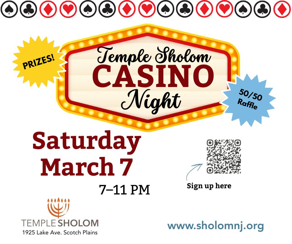 Temple Sholom 1925 Lake Avenue, Scotch Plains, NJ, United StatesTry Blackjack, Craps, poker, Roulette & Texas Hold’em with professional dealers. Compete for gift baskets and win door prizes. There's also a 50/50 raffle. First time players are welcome. Tickets: * Early-Bird (until February 21): $45 + $120 in chips * General Admission: $50 + $100 in chips * Door: $50 cash + $80 in […]